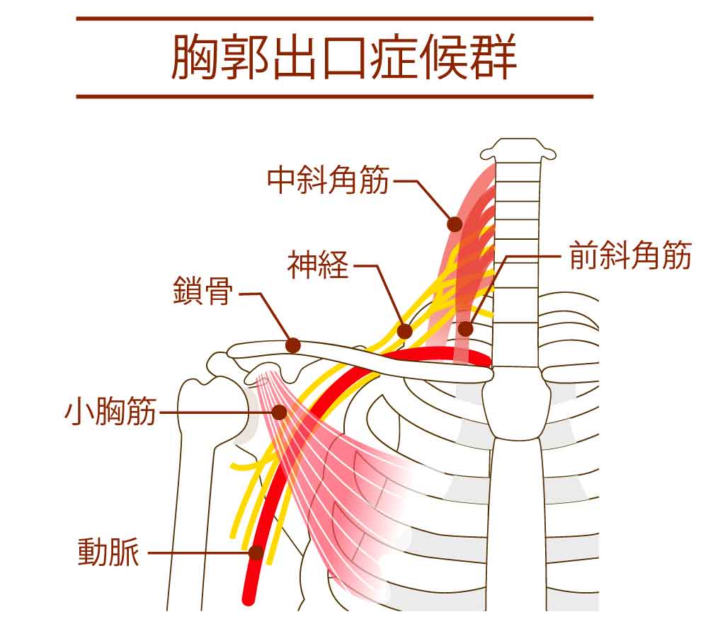 胸郭出口症候群(きょうかくしゅっこうしょうこうぐん)とは、首から腕にかけて走る神経や血管が、鎖骨・第一肋骨・筋肉などの間で圧迫・引っ張られることで起こる症状の総称です。